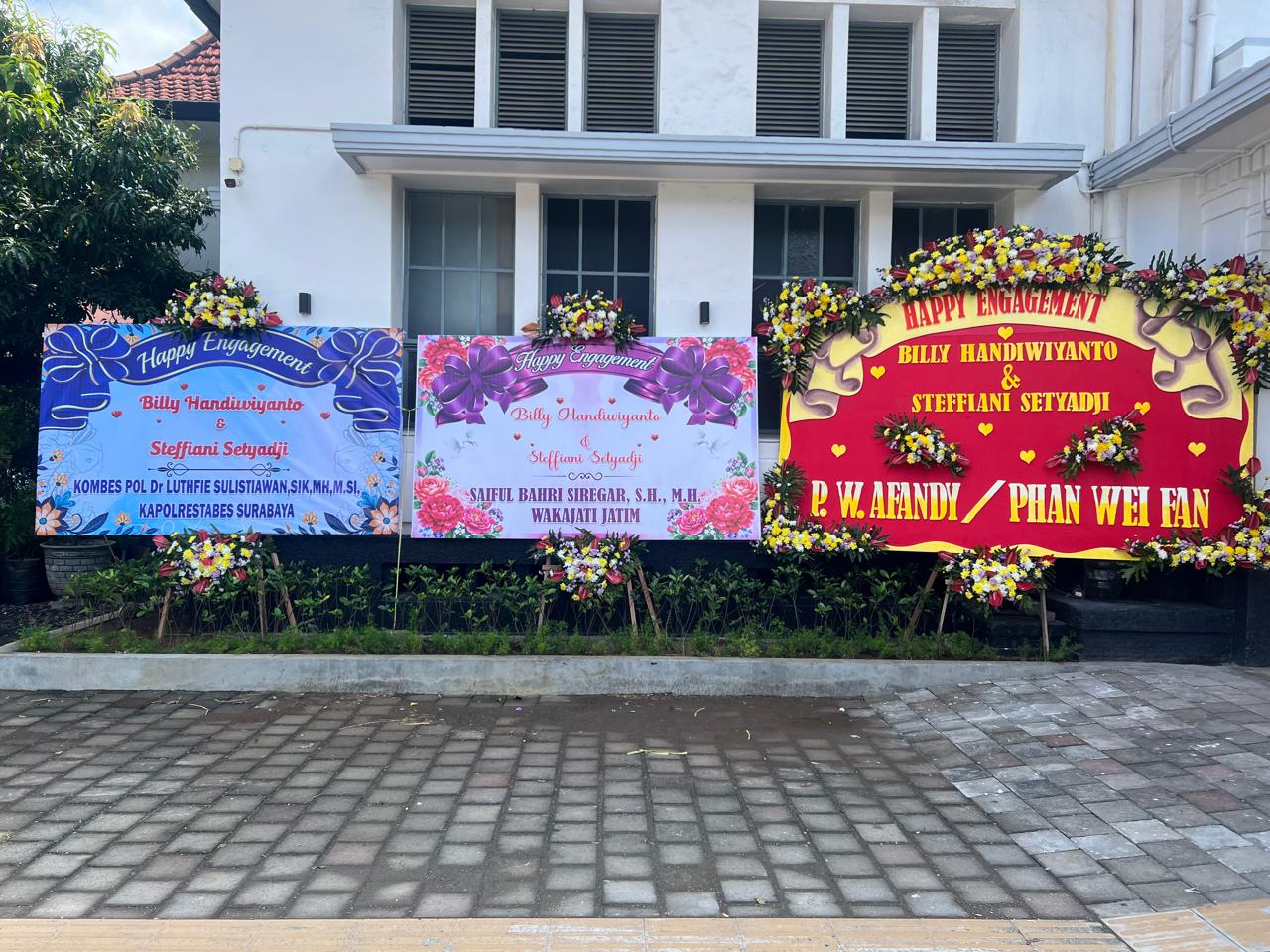 Acara lamaran putra kedua advokat senior dan ternama Surabaya, Dr. George Handiwiyanto, S.E., S.H., M.H. dengan kekasihnya itu, selain dihadiri tamu-tamu penting, juga dihiasi bunga ucapan yang berjejer rapi dilokasi tunangan Billy Handiwiyanto dan Steffiani Setyadji.