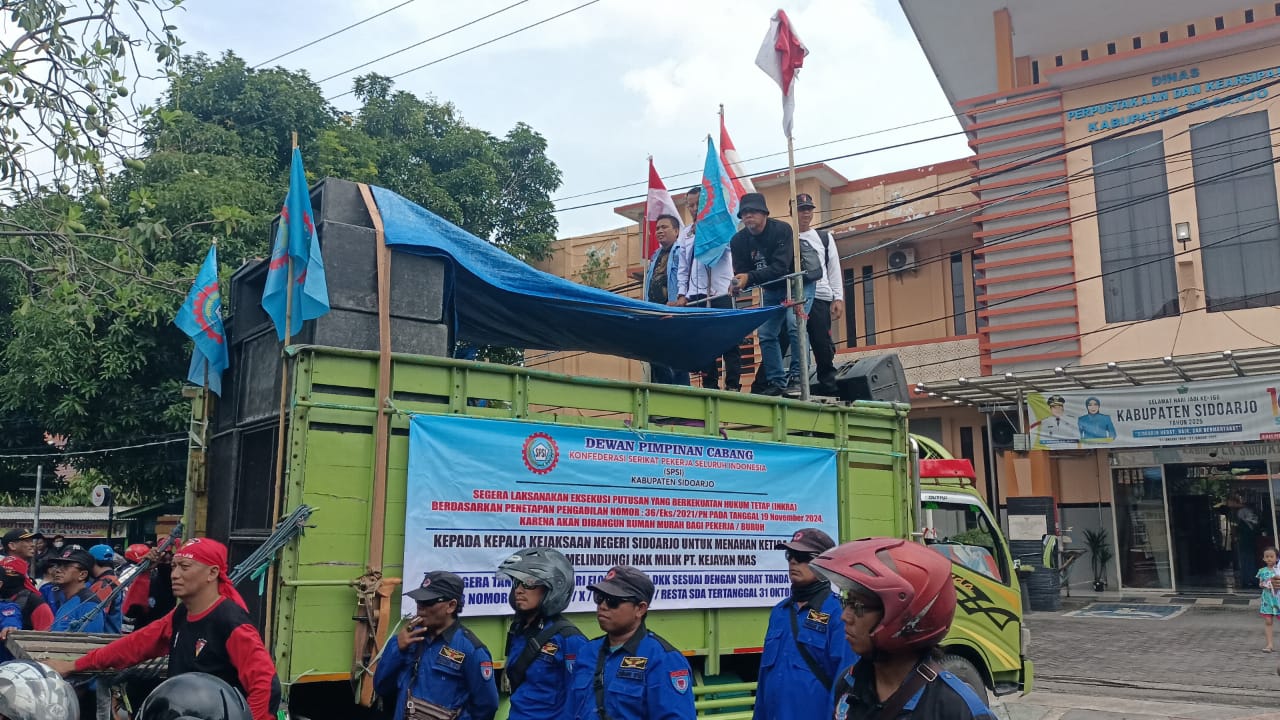 SURABAYA (pilarhukum.com) – Suasana depan Pengadilan Negeri (PN) Sidoarjo siang ini dipenuhi oleh aksi demo yang dilakukan oleh ratusan Serikat Pekerja Seluruh Indonesia (SPSI) Kabupaten Sidoarjo. Mereka menuntut agar PN Sidoarjo selaku eksekutor segera melakukan eksekusi terhadap lahan