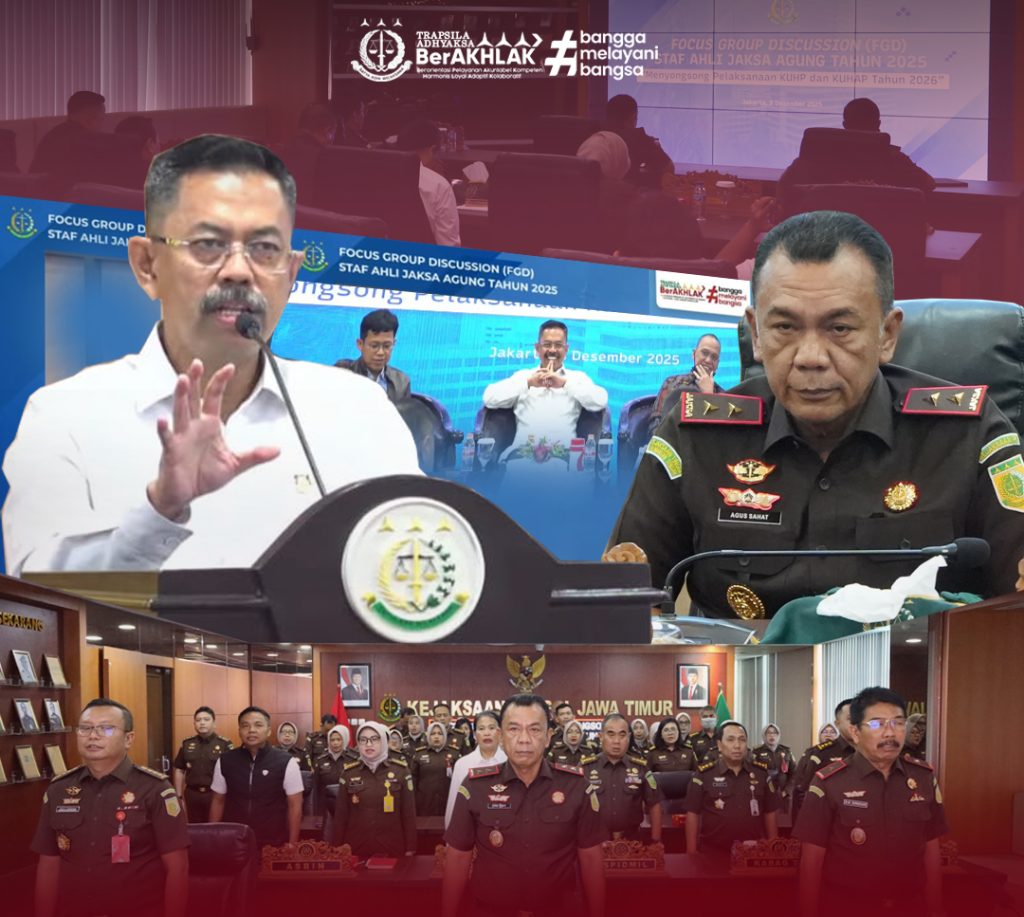 Surabaya – Kepala Kejaksaan Tinggi Jawa Timur, Agus Sahat ST, S.H., M.H., bersama Wakajati, para Asisten, Koordinator, para Kepala Seksi, serta jaksa fungsional Bidang Tindak Pidana Umum mengikuti Focus Group Discussion (FGD) Staf Ahli Jaksa Agung menyongsong pelaksanaan KUHP dan KUHAP baru Tahun 2026 secara daring dari Ruang Rapat Kejati Jatim, Senin (8/12/2025).
