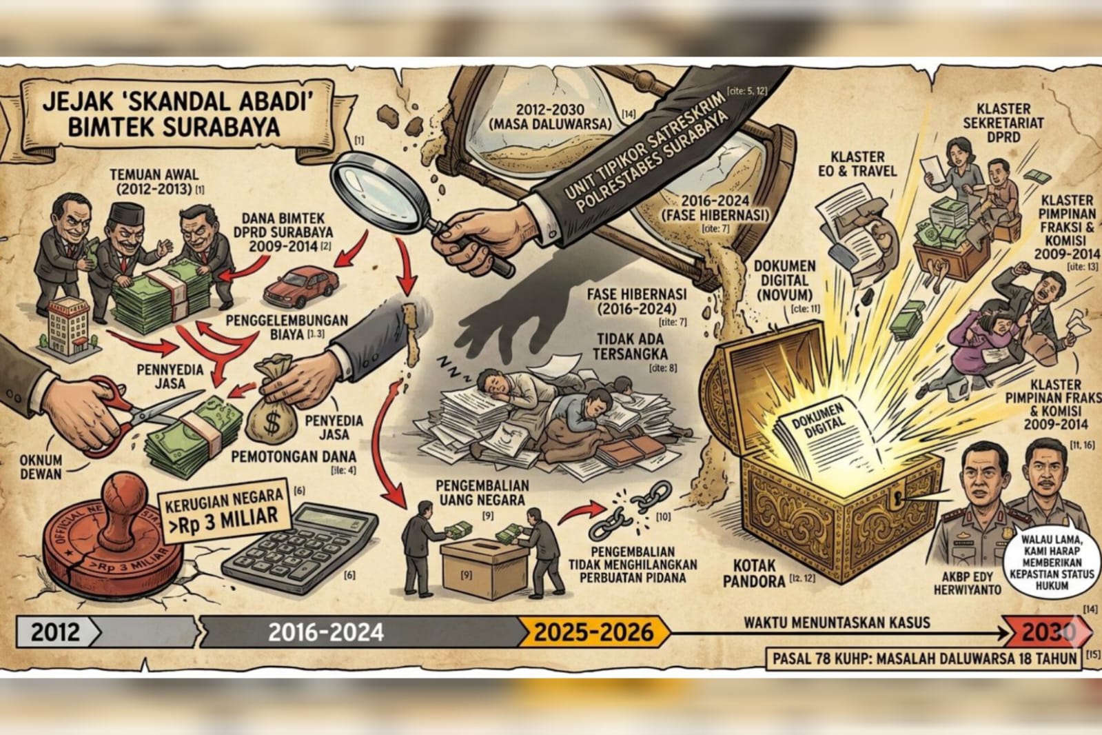 Polisi masih memiliki waktu lima tahun hingga 2030 untuk menuntaskan kasus dugaan penyelewengan dana Bimtek 2012 ini. Hal itu karena, secara hukum menurut pasal 78 KUHP masa daluwarsa sebuah kasus adalah 18 tahun. Kanit Tipikor Satreskrim Polrestabes Surabaya Iptu Taufan menegaskan pihaknya akan terus bekerja keras demi memperoleh setiap fakta dan bukti untuk membuat perkara Bimtek 2012 semakin terang.
